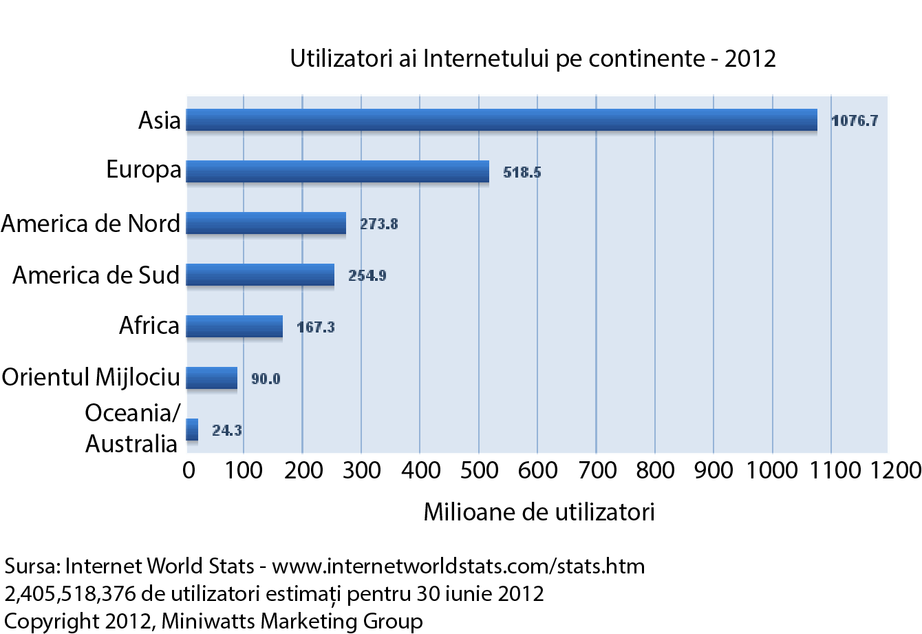 Conform unui studiu realizat în 2012, numărul oamenilor conectaţi la Internet a depășit 2,4 miliarde.