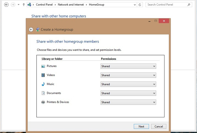 Pasi: (1) Control Panel -> Network and Internet -> Home Group -> (2) Create a Home Group/ "Join now" (...wizard)-> NEXT -> (3) Selecteaza fisierele si dispozitivele pe care vrei sa le imparti