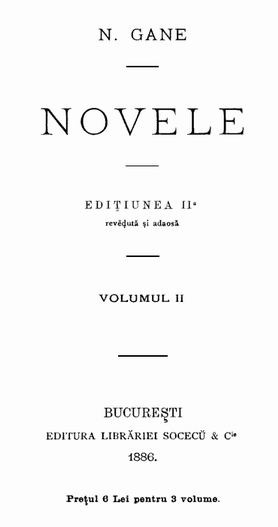 • Nicolae Gane a fost scriitor şi membru al Academiei Române, având o bogată activitate literară. A debutat în revista „Convorbiri Literare” a societăţii Junimea din Iaşi. Deşi a avut o activitate literară însemnată, fiind poet, prozator, memorialist, eseist şi traducător, Nicolae Gane a rămas în istorie în primul rând prin Novelele sale, tipărite în 1880, dar şi prin romanul „Trecute vieţi de doamne şi domniţe”.